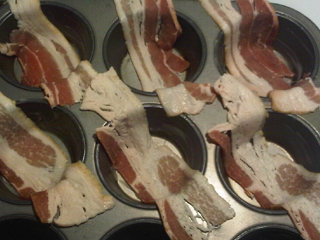 4. Stretch the bacon strips slightly, cut them in half and place bacon in the muffin pan slots.