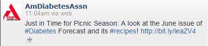 I saw this TWEET below and it was SCREAMING AT ME for a post … and it REALLY irritated the hell out of me.  It’s the American Diabetes Association  promoting it’s online rag’s summer recipe section… 36 grams of CARBS per serving. Oh… and a serving = 1 cup.   ugh.