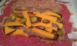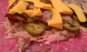 Next add sausage and more bacon… plus any other ingredients… I chose jalapenos and cheese. :)