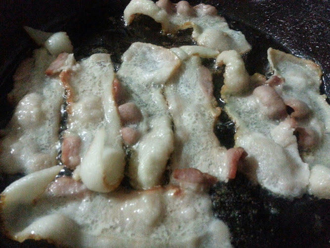 I cover it while it cooks and prepare my omelette contents. I cut up the bacon and other items.